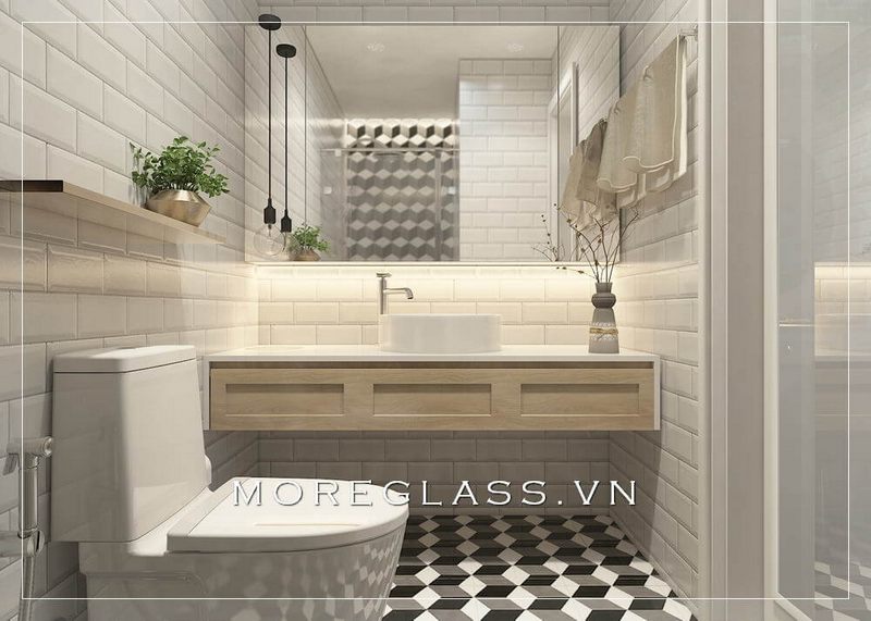Mẫu thiết kế phòng vệ sinh hiện đại, có diện tích nhỏ gọn với các bố trí nội thất hợp lý, không gian được bố trí hài hòa và các ngăn nắp giúp tạo nên không gian thoáng mát hơn.