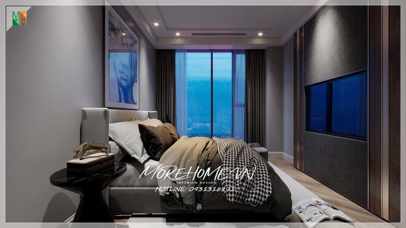 Thiết kế phòng ngủ của chung cư hiện đại và đơn giản, với giường ngủ bọc nỉ đầu giường ấn tượng, đèn bàn tinh tế, tranh treo tường độc đáo, sàn nhà màu nâu trầm ấm áp, và chiếc ghế thư giãn màu be... tất cả đều tạo nên một không gian nghỉ ngơi thoáng mát và tinh tế.