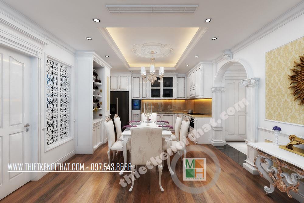 Thiết kế phòng bếp sử dụng tông màu trắng trang nhã mang lại cảm giác nhẹ nhàng và tinh tế cho gia chủ. Hệ thống tủ bếp hay tủ rượu được thiết kế tinh xảo và đẹp mắt thu hút sự chú ý và tạo điểm nhấn cho căn phòng. Tuy diện tích mặt bằng chung của khu bếp không quá rộng nhưng các hiệu ứng về màu sắc và chất liệu nhẹ như gỗ đã làm cho không gian trở nên mở và thoáng hơn nhiều.